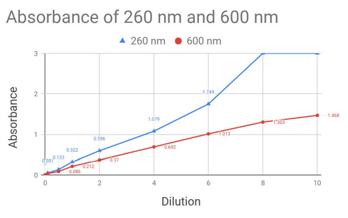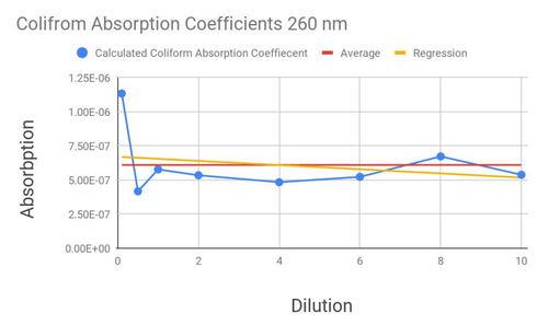 From here, I was able to calculate an absorption coefficient for E. coli (Using Beer-Lamberts Law, which tells us per coliform how much light is absorbed), which means that in a sample of unknown E. coli concentration could be tested and estimated. Testing was done with a 600nm light, using the labs spectrophotometer, to compare sensitivity.