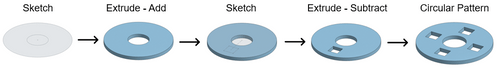 When we design in CAD, we think of it as a sequence of geometric operations which lead to a final geometry which is hopefully what we originally envisioned. In the first image below, we can see a simple part being generated by a 2D sketch, which is then extruded, a geometric operation which gives thickness. More operations are done such that we get our final geometry.