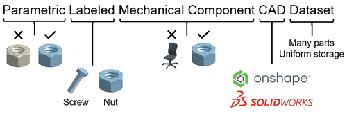 We need a parametric labeled mechanical component CAD dataset for this project. Parametric like discussed before meaning parts are defined using a sequence of geometric operations. Labeled meaning parts have broad categorical labels such as screw or nut, mechanical component meaning it is a standardized component; bearings, gears and all these kinds of parts go here. CAD meaning the parts exist in a CAD software such as Solidworks or Onshape. And dataset meaning we have lots of parts.