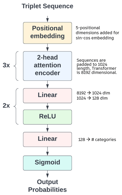 The classification model we build uses pre-established methods and ideas in sequence based machine learning., namely a set of attention encoders which then are processed by linear and non-linear layers. This is similar to what is seen in the BERT architecture. The model takes in the triplets, adds 5 dimensions to the vectors as well as positionally embeds them using standard sine-cosine embedding. This is followed by three, two-headed attention encoders, which look at the whole sequence, followed by the linear and non-linear layers. The outputs correspond to the models predictions. Cross entropy loss is used as the criterion for model evaluation.