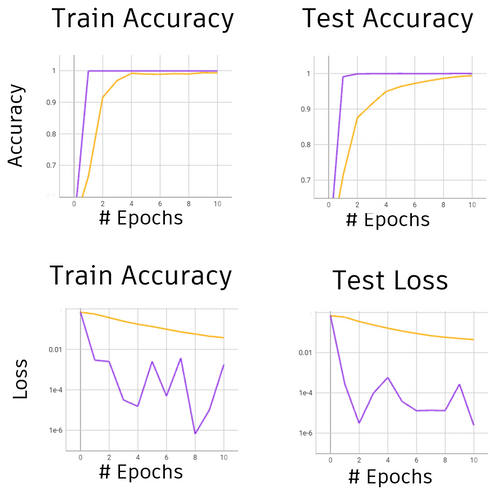 Since we currently only have a set of screws and nuts, we are limited to binary classification. Results for multi-category classification will be posted once the data is available. The model is trained using a 90/10 train test split, and is trained using stochastic gradient descent in yellow, and using ADAM in purple, using the default values of each in their respective paper(s). After ten epochs of training, the model achieves over 99% accuracy on both test and train, using both optimizers, and achieves a low loss. While it is true that a binary classification task is easier than multi-classification this still goes to show that the model is capable of learning to tell the difference between screws and nuts using their parametric information.